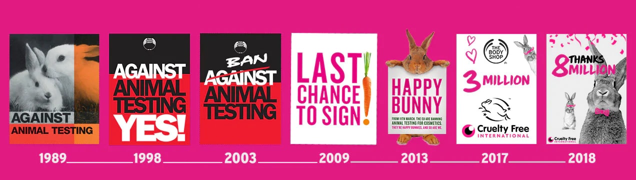 Estas firmas representan el éxito más reciente de más de 30 años de lucha de Cruelty Free International y The Body Shop, la primera marca internacional de cosmética en luchar contra los test en animales en la industria. No lo podríamos haber conseguido sin ti. Todavía queda mucho por hacer, pero con tu ayuda, sabemos que lo lograremos.»