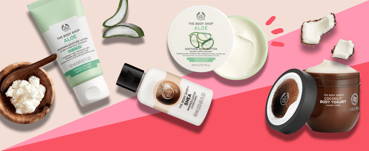 Manteca de karité: Derivada de la nuez de un árbol de karité, esta manteca es un ingrediente usado en muchos humectantes. Es un producto conocido principalmente por sus propiedades cosméticas, regeneradoras y suavizantes para la piel. El karité es rico en ácidos grasos, vitaminas A, D, E, F, y resulta ser un gran aliado para mantener la hidratación y humectación del rostro y el cuerpo. Su uso continuado tiene efectos preventivos de anti-envejecimiento. Esta manteca actúa recubriendo la piel evitando la deshidratación y la protege de las agresiones externas como quemaduras del sol. En The Body Shop contamos con una línea completa de productos elaborados en base a esta manteca, como cremas de cuerpo, geles de ducha, exfoliantes y bálsamos labiales que dejan un aroma, suavidad e hidratación única en la piel.