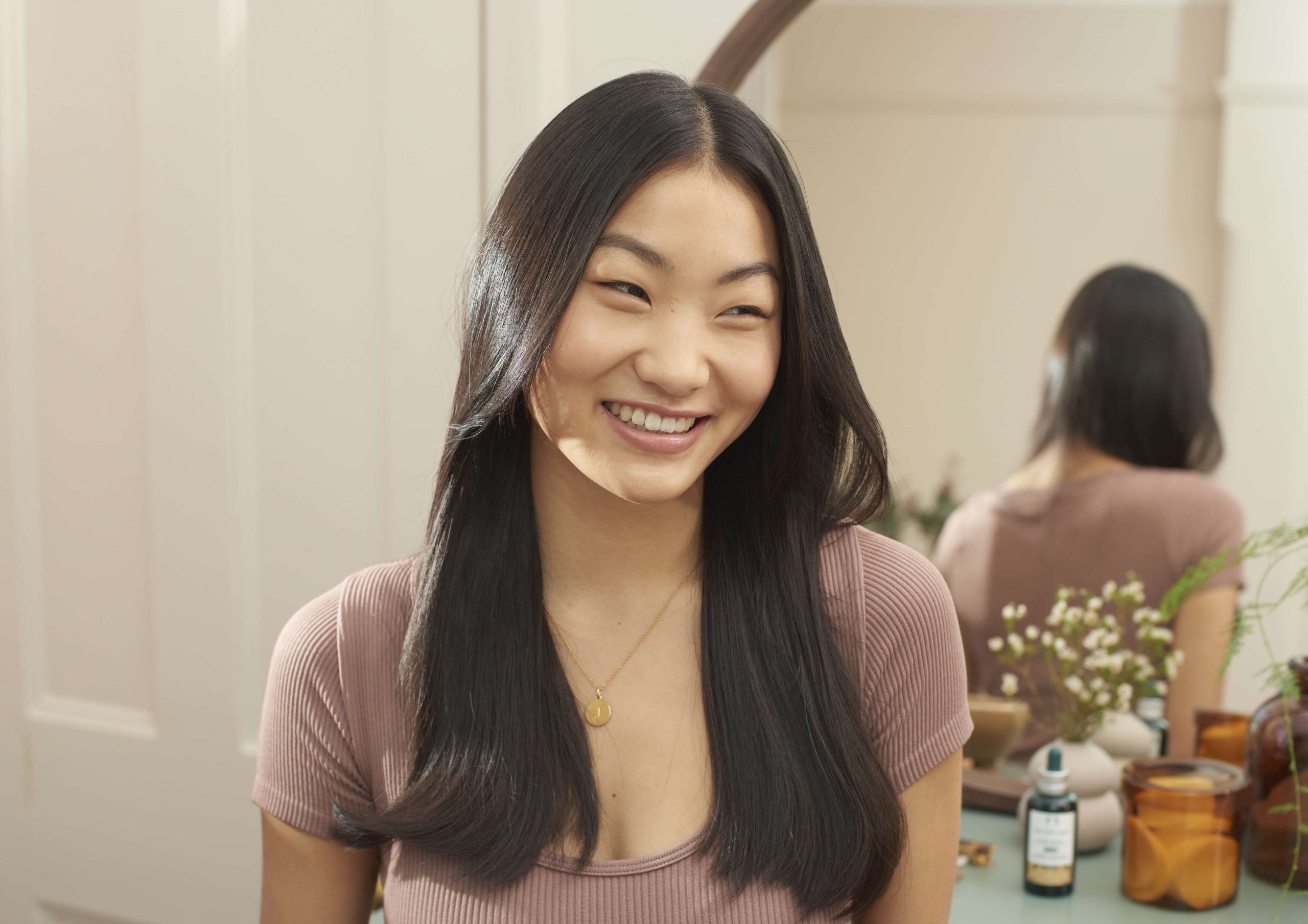 2. Usando un peine o los dedos, separa el cabello y aplica una o dos gotas de serum directamente sobre el cuero cabelludo.