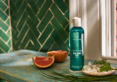 Aplica nuestro Gel de cabello y cuerpo Blue Musk Zest y huele de maravilla desde el momento en que sales de la ducha.