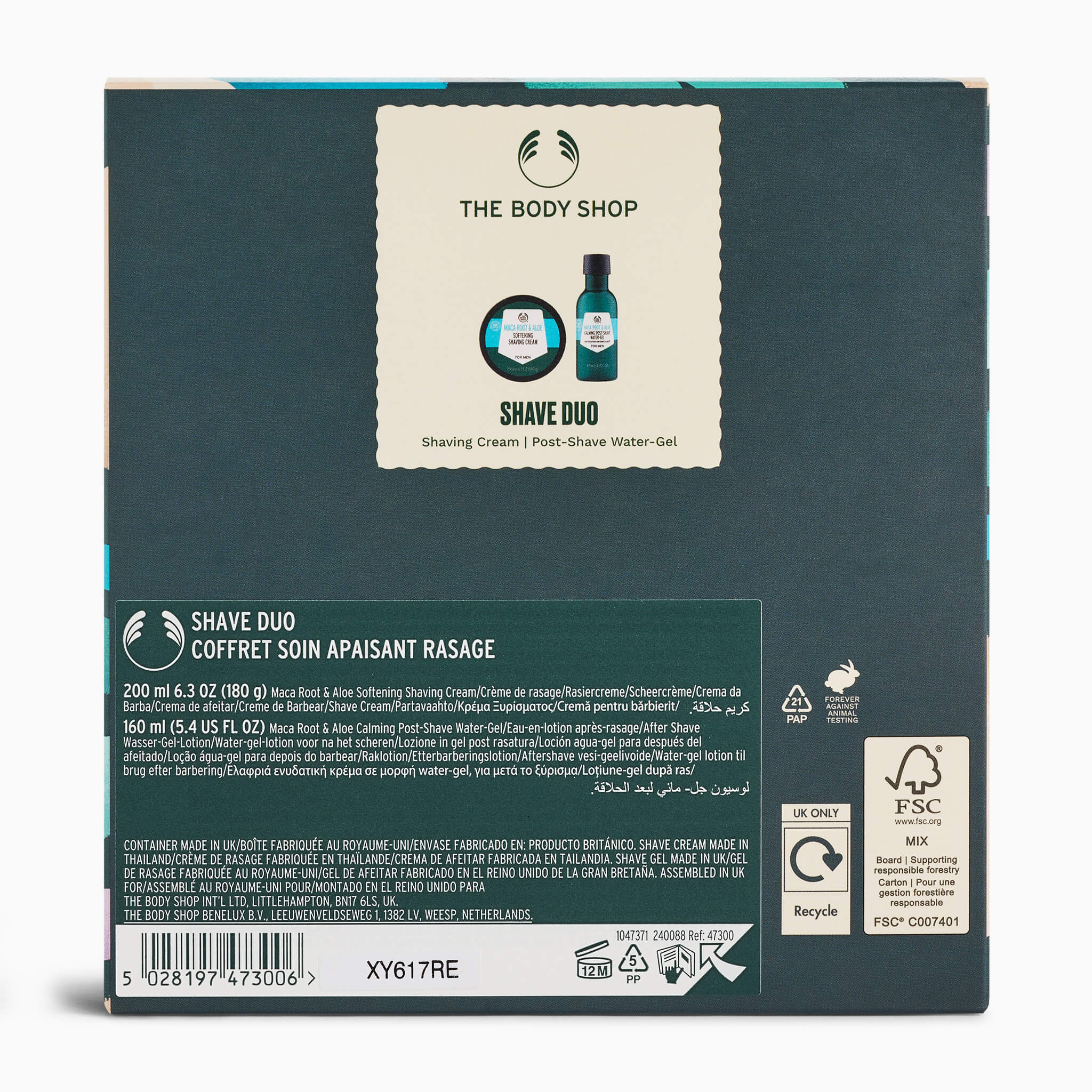 Haz que regalar sea más fácil con nuestro dúo de afeitado para hombre, un detalle muy considerado para él en estas fiestas. Este set incluye la crema de afeitar y el gel para después del afeitado con raíz de maca y aloe, ambos enriquecidos con aloe vera de comercio justo comunitario procedente de México, para ayudar a calmar la sequedad y cuidar la piel. Juntos, proporcionan un afeitado suave y cómodo, dejando la piel fresca y nutrida. Este set de regalo contiene: Gel para después del afeitado con raíz de maca y aloe, 160 ml. Crema de afeitar con raíz de maca y aloe, 200 ml.