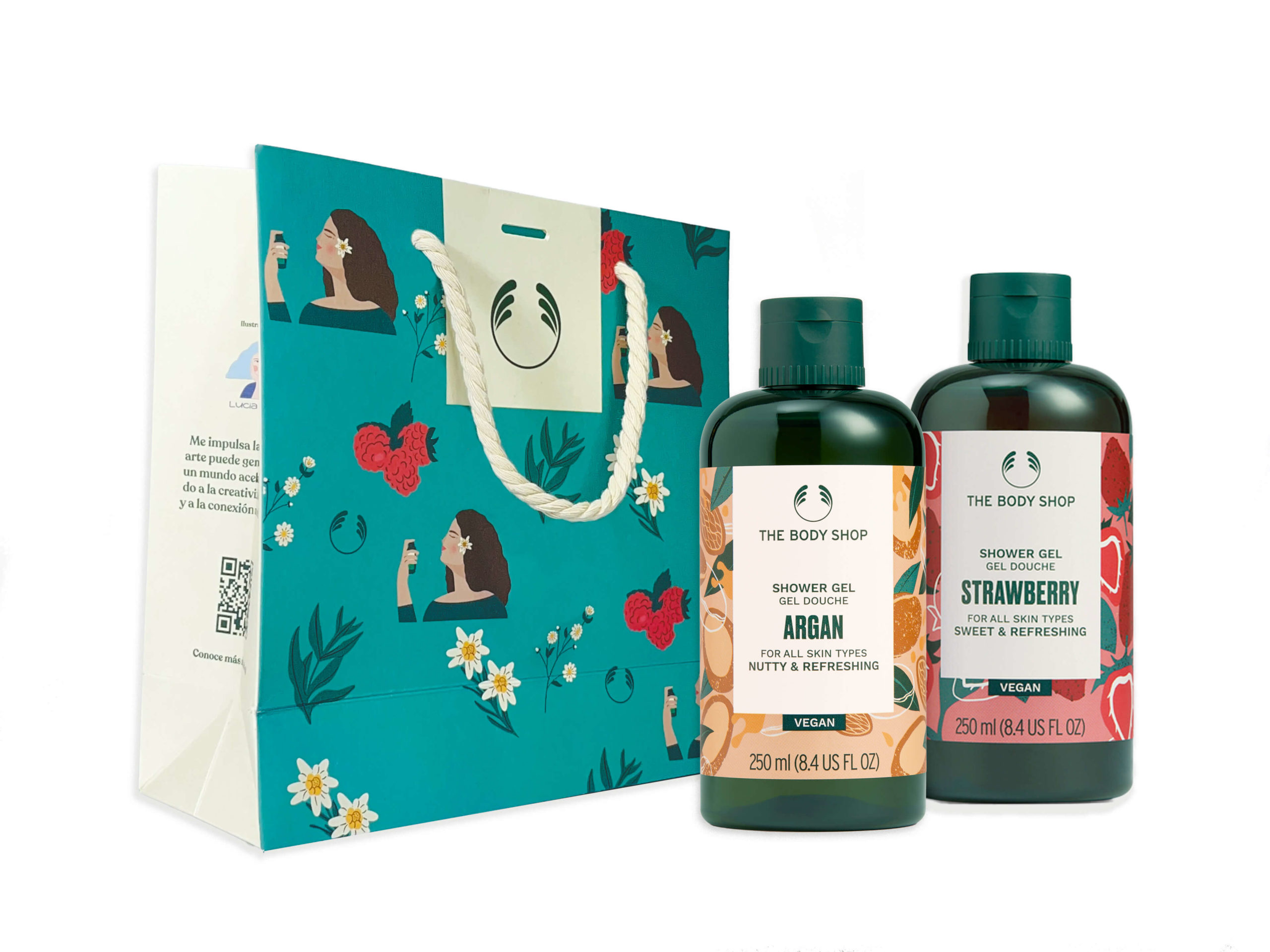 Empieza tu día con energía gracias a nuestro Regalo Dúo de Geles de Ducha, que incluye dos exquisitos geles de ducha de 250ml, de Argán y Frutilla, cada una elaborada con ingredientes de origen natural y certificadas por The Vegan Society.
